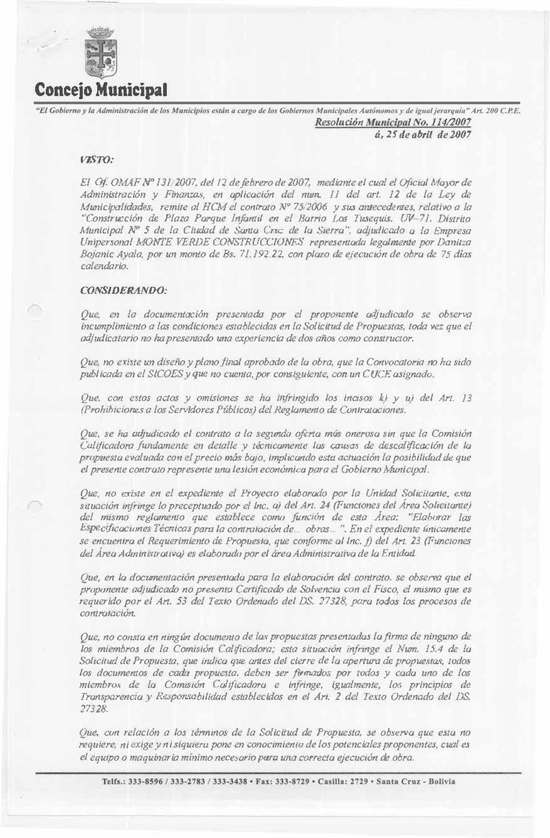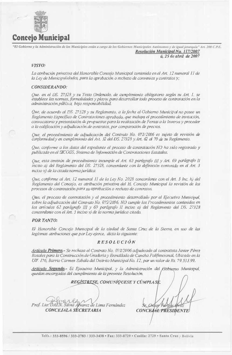 Rechaza el Contrato N° 072/2006 adjudicado al contratista Javier Pérez Rosales para la Construcción de Gradería y Enmallado de Cancha Polifuncional, Ubicada en la UV. 176, Barrio Carmen Zabala del Distrito Municipal No. 12, por un valor de Bs. 79.533.99 (Setenta y Nueve Mil Quinientos Treinta y Tres 99/100 Bolivianos).