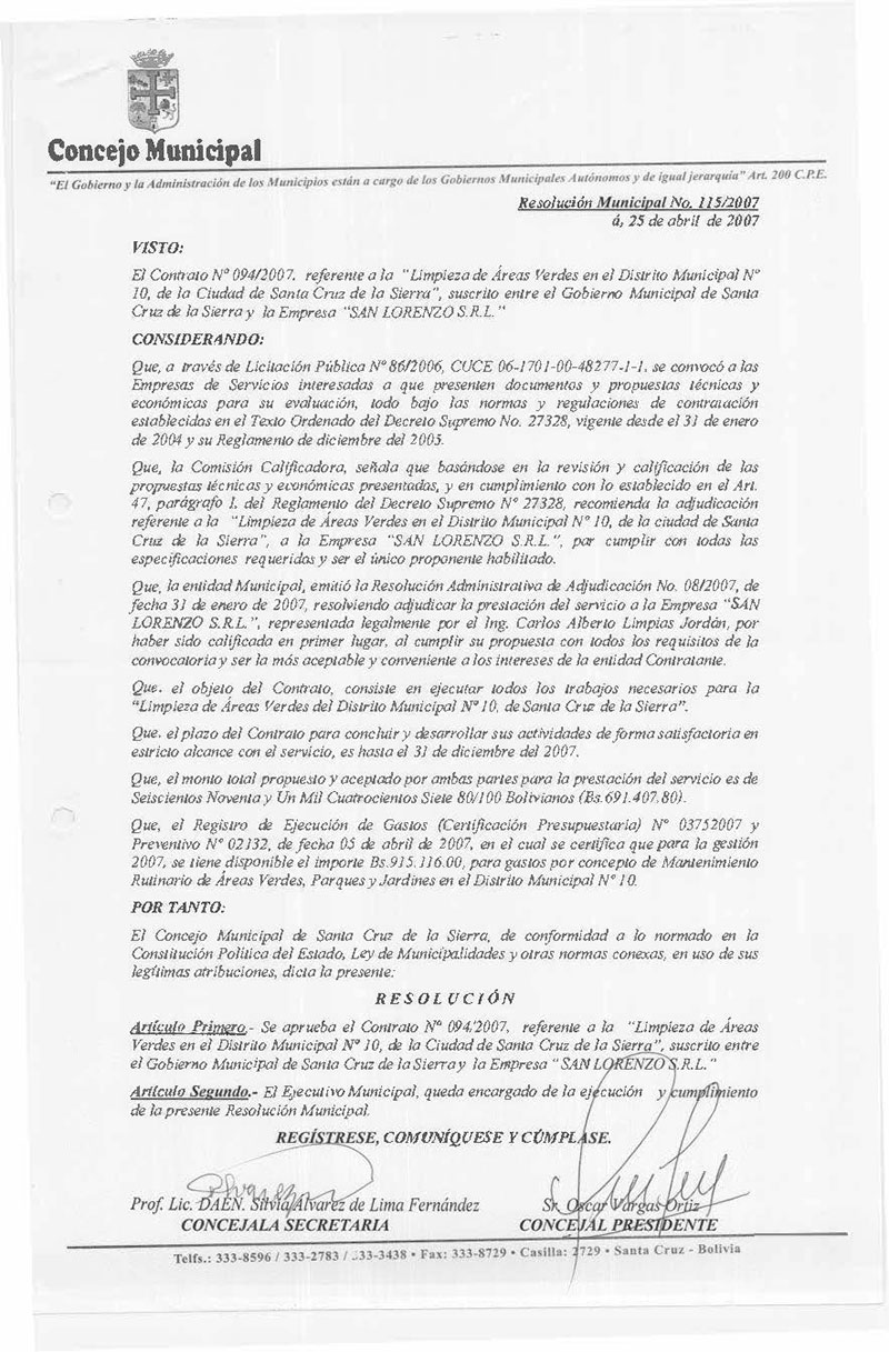 Aprueba el Contrato Nº 094/2007, referente a la “Limpieza de Áreas Verdes en el Distrito Municipal Nº 10, de la Ciudad de Santa Cruz de la Sierra”, suscrito con la Empresa “SAN LORENZO S.R.L.”.