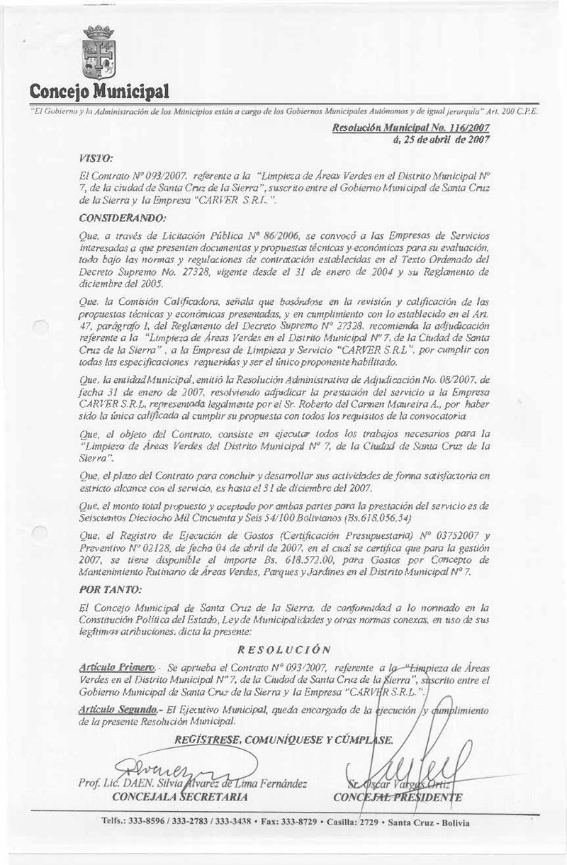 Aprueba el Contrato Nº 093/2007, referente a la “Limpieza de Áreas Verdes en el Distrito Municipal Nº 7, de la Ciudad de Santa Cruz de la Sierra”, suscrito con la Empresa “CARVER S.R.L.”.