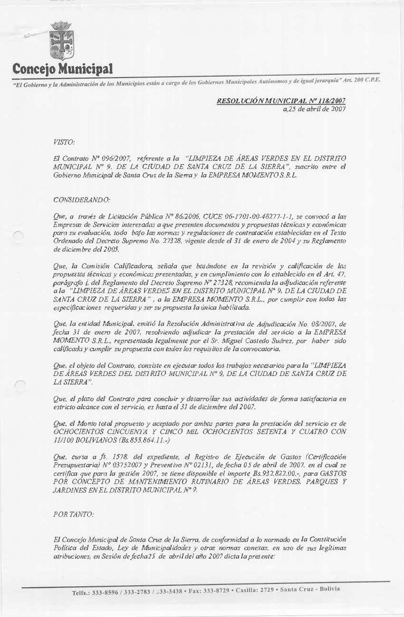Aprueba el Contrato Nº 096/2007, referente a la “LIMPIEZA DE ÁREAS VERDES EN EL DISTRITO MUNICIPAL Nº 9, DE LA CIUDAD DE SANTA CRUZ DE LA SIERRA”, suscrito entre el Gobierno Municipal de Santa Cruz de la Sierra y la EMPRESA MOMENTO S.R.L.