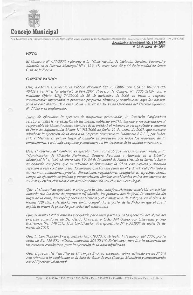 Rechaza el Contrato Nº 017/2007, referente a la “Construcción de Ciclovía, Sendero Peatonal y Alameda en el Distrito Municipal Nº 4, U.V. 48, entre Mzs. 39 y 36 de la ciudad de Santa Cruz de la Sierra.