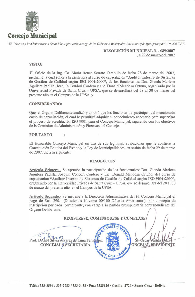 Aprueba la participación de los funcionarios Dra Glenda Marlene Aguilera Padilla, Joaquin Condori Cordero y Lic. Donald Mendoza Ortuño, del curso de capacitación "Auditor Interno de Sistemas de Gestión de Calidad según ISO 9001:2000", organizado por la Universidad Privada de Santa Cruz - UPSA.