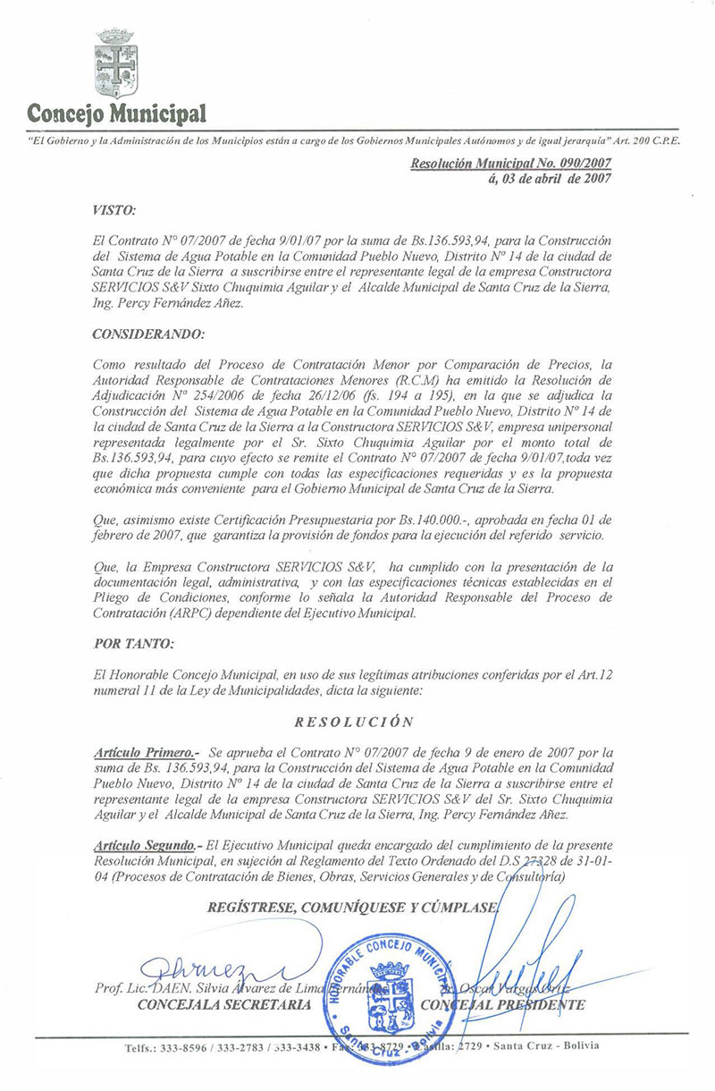 Aprueba el Contrato N° 07/2007, para la Construcción del Sistema de Agua Potable en la Comunidad Pueblo Nuevo, Distrito Nº 14 de la ciudad de Santa Cruz de la Sierra, por la suma de Bs. 136.593,94 (Ciento Treinta y Seis Mil Quinientos Noventa y Tres 94/100 Bolivianos), a suscribirse con la empresa Constructora SERVICIOS S.
