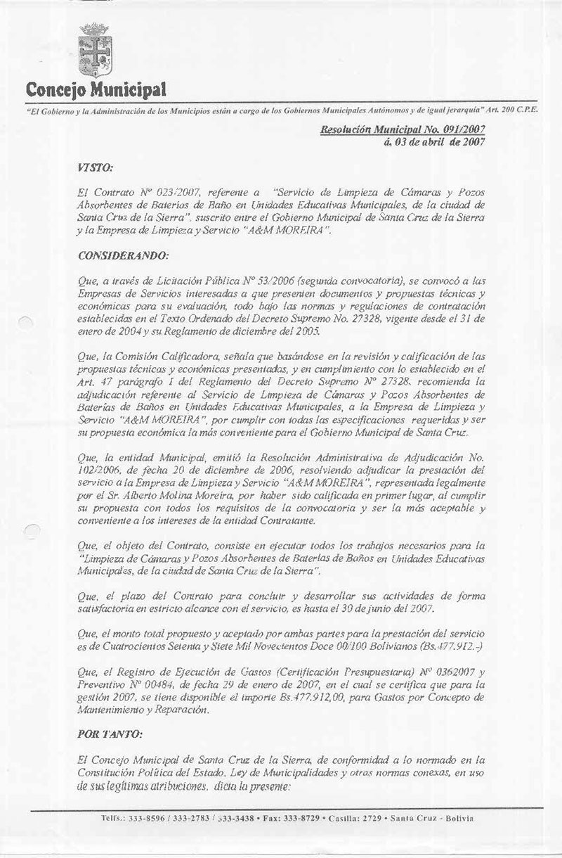 Aprueba el Contrato Nº 023/2007, referente al “Servicio de Limpieza de Cámaras y Pozos Absorbentes de Baterías de Baño en Unidades Educativas Municipales, de la ciudad de Santa Cruz de la Sierra”, suscrito entre el Gobierno Municipal de Santa Cruz de la Sierra y la Empresa de Limpieza y Servicio “A.