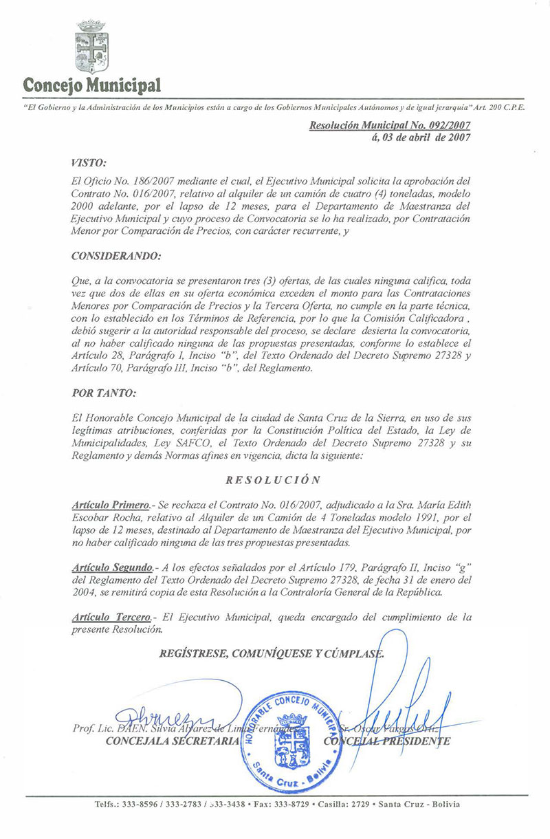 Rechaza el Contrato N° 016/2007, a relativo al alquiler de un camión de 4 toneladas modelo 1991, por el lapso de 12 meses, destinado al Departamento de Maestranza adjudicado a la Sra. María Edith Escobar Rocha, por no haber calificado ninguna de las tres propuestas presentadas.