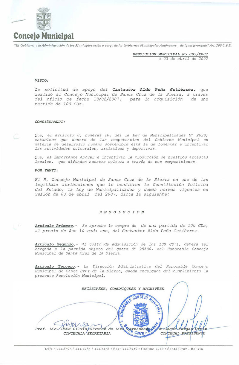 Aprueba la compra de de una partida de 100 CDs, al precio de $us 10 cada uno, del Cantautor Aldo Peña Gutiérrez.
