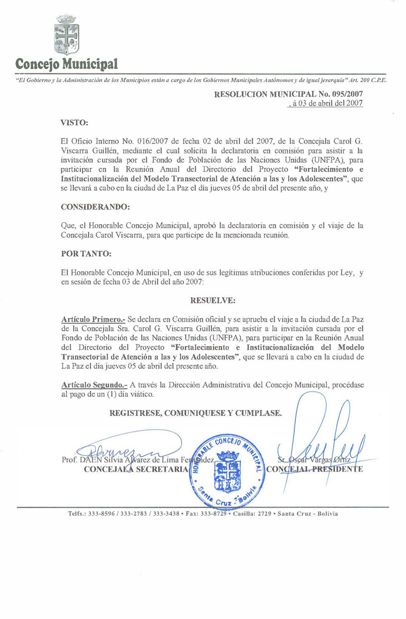 Declara en Comisión Oficial y aprueba el viaje a la ciudad de La Paz de la Concejal Sra. Carol Genevieve Viscarra Guillén, para asistir a la invitación cursada por el Fondo de Población de las Naciones Unidas (UNFPA), para participar en la Reunion Anual del Directorio del Proyecto "Fortalecimiento e Institucionalización del Modelo Transectorial de Atención a las y los Adolescentes", que se llevará a cabo en la ciudad de La Paz el día jueves 05 de abril del presente año.