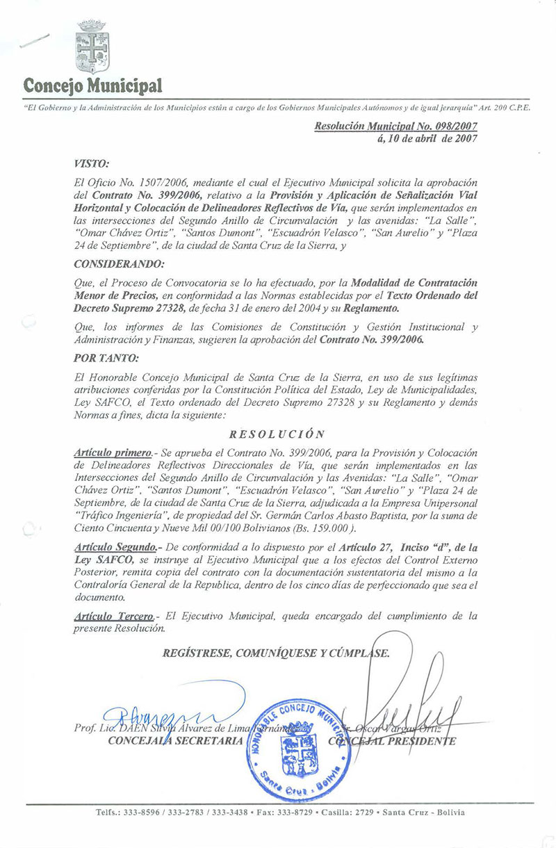 Aprueba el Contrato N° 399/2006, para la Provisión y Colocación de Delineadores Reflectivos Direccionales de Vía, que serán implementados en las Intersecciones del Segundo Anillo de Circunvalación y las Avenidas: “La Salle”, “Omar Chávez Ortiz”, “Santos Dumont”, “Escuadrón Velasco”, “San Aurelio” y “Plaza 24 de Septiembre, de la ciudad de Santa Cruz de la Sierra, adjudicada a la Empresa Unipersonal “Tráfico Ingeniería”, por la suma de Bs. 159.000 (Ciento Cincuenta y Nueve Mil 00/100 Bolivianos).