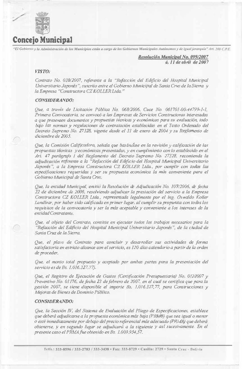 Rechaza el Contrato Nº 030/2007, referente a la “Refacción del Edificio del Hospital Municipal Universitario Japonés”, suscrito con la Empresa “Constructora CZ Koller Ltda.”.