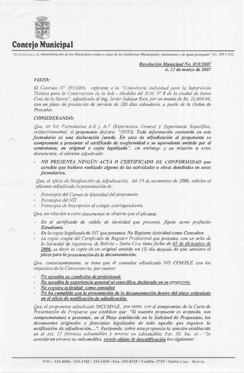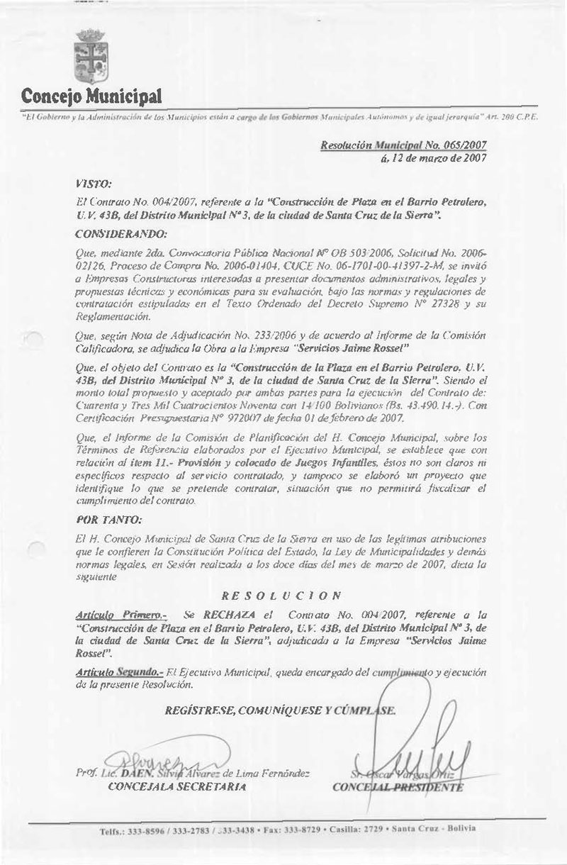 Rechaza el Contrato N° 004/2007, referente a la “Construcción de Plaza en el Barrio Petrolero, U.V. 43B, del Distrito Municipal Nº 3, de la ciudad de Santa Cruz de la Sierra”, adjudicada a la Empresa “Servicios Jaime Rossel”.
