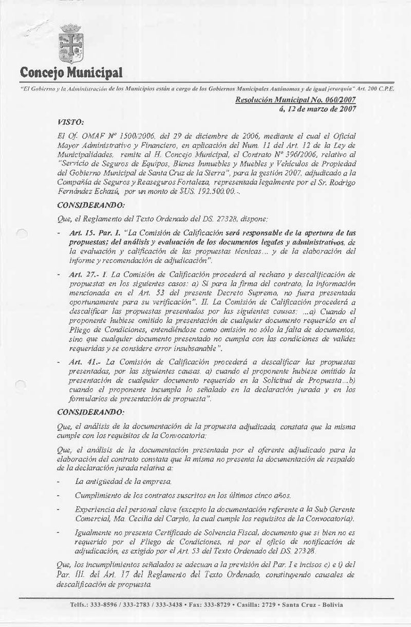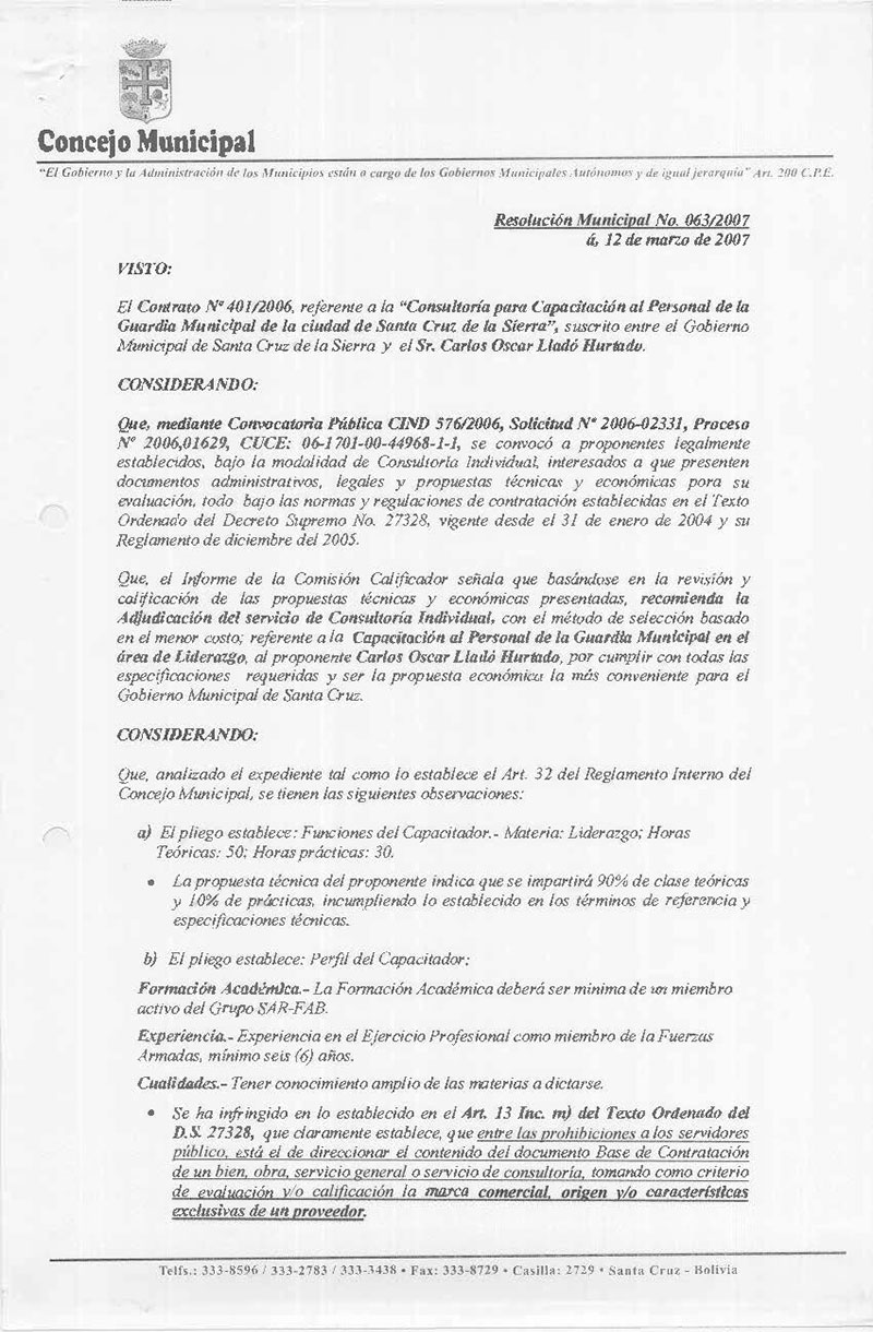 Rechaza el Contrato Nº 401/2006, referente a la “Consultoría para Capacitación al Personal de La Guardia Municipal de la ciudad de Santa Cruz de la Sierra”, suscrito con el Sr. Carlos Oscar Lladó Hurtado.