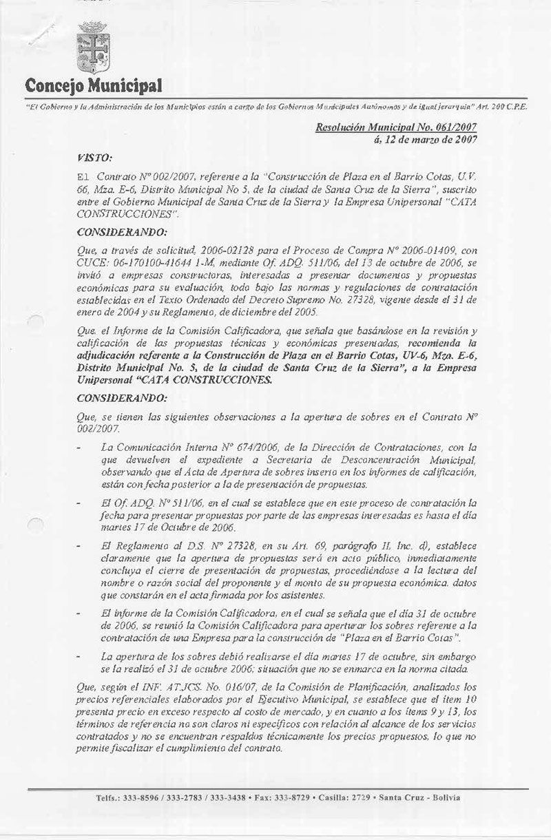 Rechaza el Contrato Nº 002/2007, referente a la “Construcción de Plaza en el Barrio Cotas, U.V. 66, Mza. E-6, Distrito Municipal N° 5, de la ciudad de Santa Cruz de la Sierra”, suscrito con la Empresa Unipersonal “CATA CONSTRUCCIONES”.