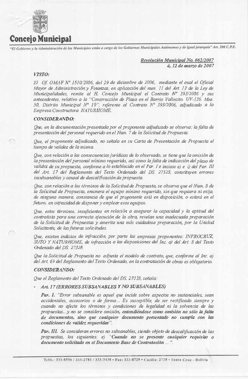 Rechaza, el Contrato N° 393/2006, relativo a la construcción de Plaza en el Barrio Vallecitos, U.V. 136, Distrito N° 10, adjudicado a la Empresa Constructora NATURHOME, por incumplimiento a las Condiciones de la Convocatoria.