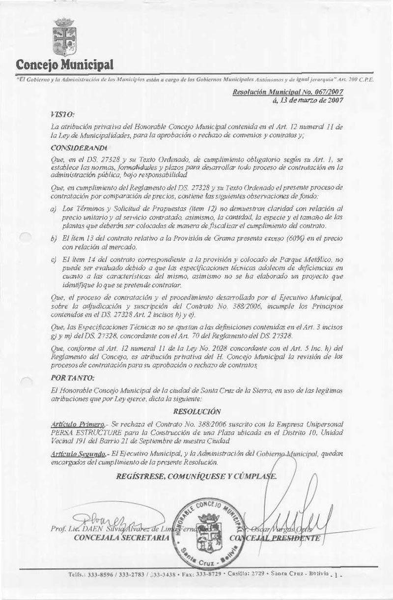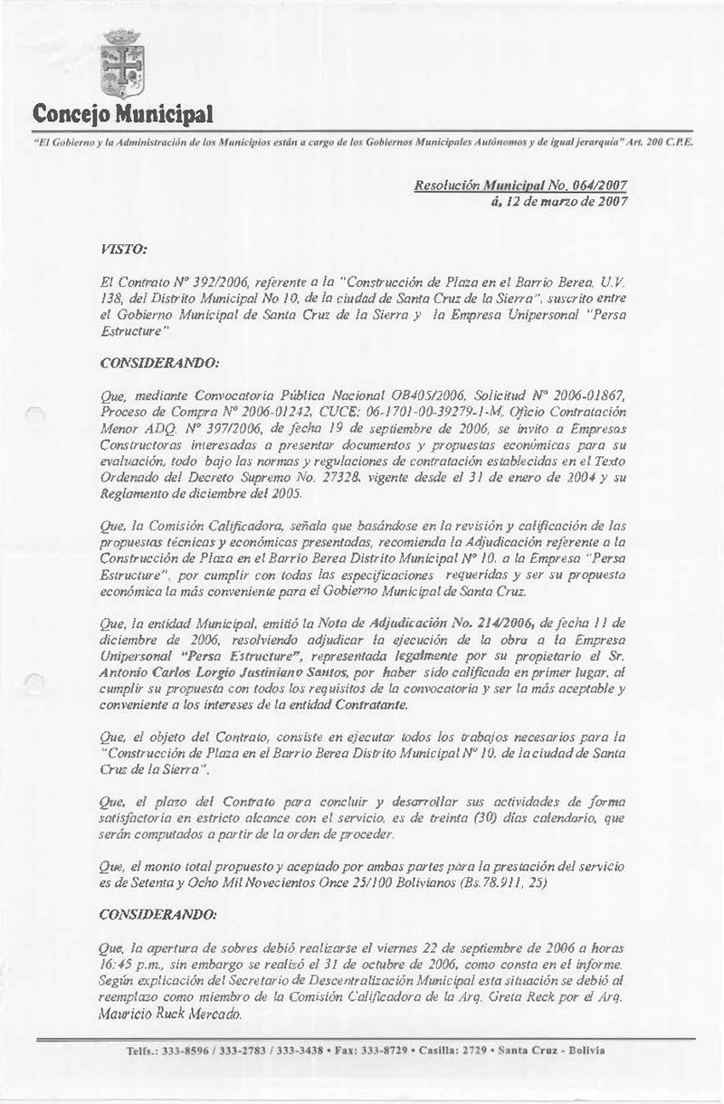 Rechaza el Contrato Nº 392/2006, referente a la “Construcción de Plaza en el Barrio Berea Distrito Municipal Nº 10, de la ciudad de Santa Cruz de la Sierra”, suscrito con la Empresa Unipersonal “Persa Estructure”.
