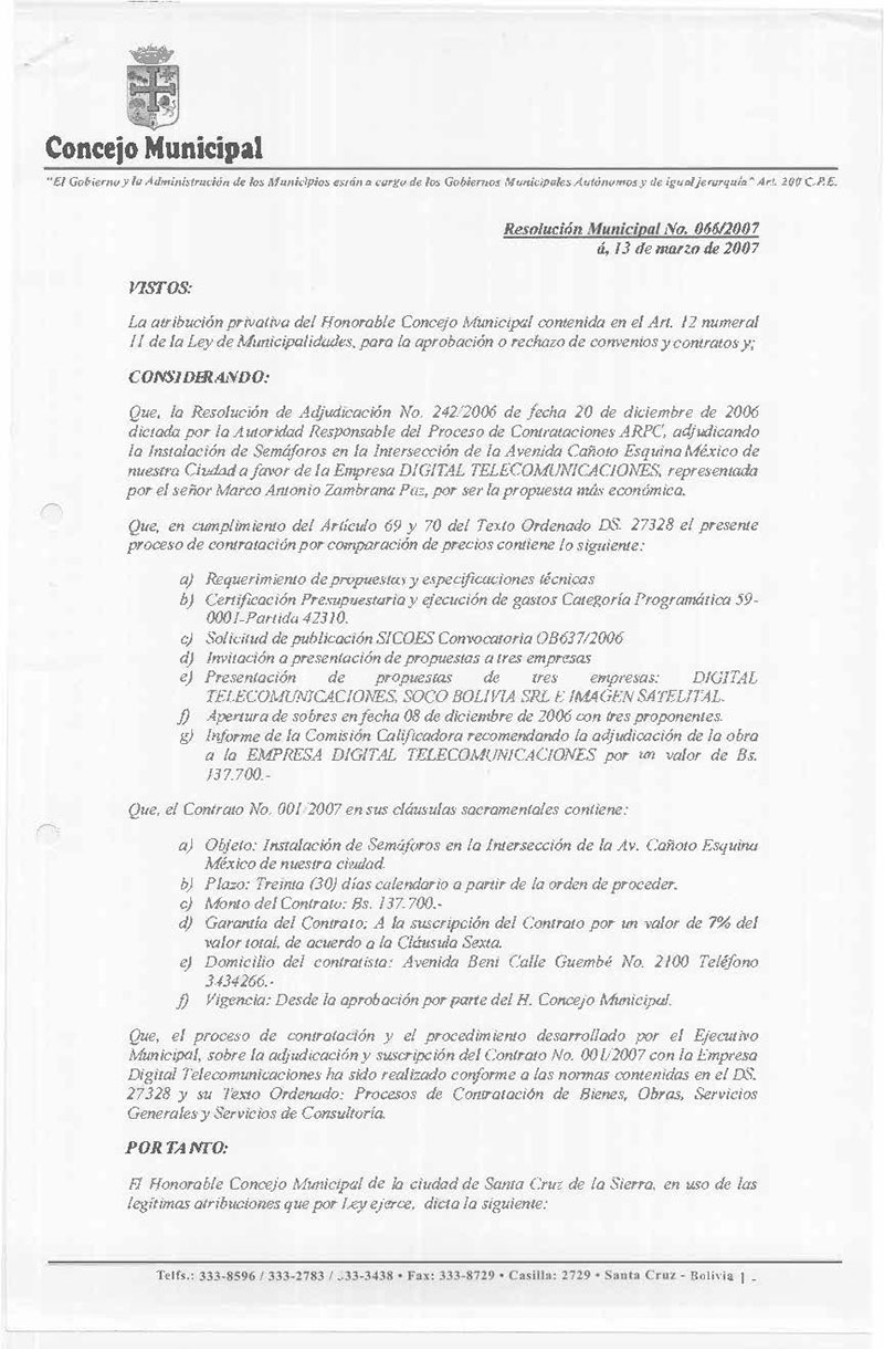 Aprueba el Contrato N° 001/2007,para la Instalación de Semáforos en la Intersección de la Avenida Cañoto Esquina México de nuestra ciudad, por un valor de Bs. 137.700 (Ciento Treinta y Siete Mil Setecientos 00/100).