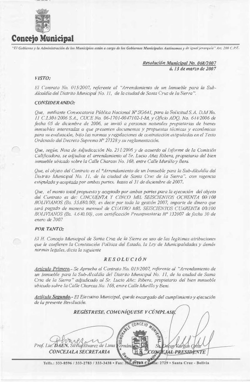 Aprueba el Contrato N° 015/2007, referente al “Arrendamiento de un Inmueble para la Sub-Alcaldía del Distrito Municipal N° 11, de la ciudad de Santa Cruz de la Sierra” adjudicado al Sr. Lucio Añez Ribera, propietario del bien inmueble ubicado sobre la Calle Charcas N° 168, entre Calle Murillo y Beni.
