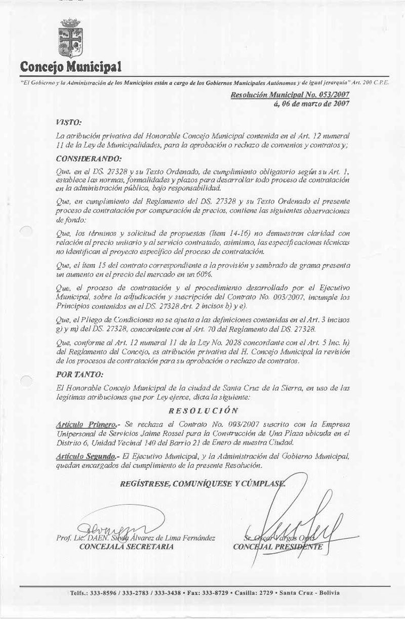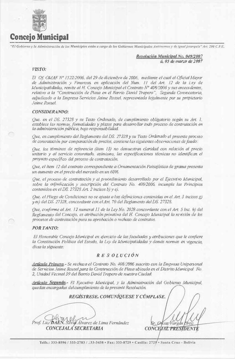 Rechaza el Contrato N° 003/2007 suscrito con la Empresa Unipersonal de Servicios Jaime Rossel para la Construcción de Una Plaza ubicada en el Distrito 6, Unidad Vecinal 140 del Barrio 21 de Enero de nuestra Ciudad.