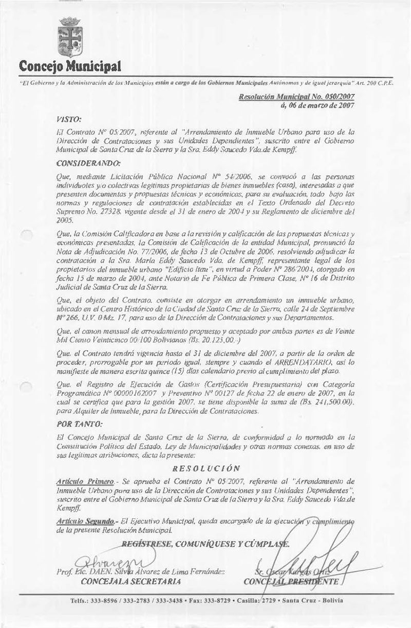 Aprueba el Contrato Nº 05/2007, referente al “Arrendamiento de Inmueble Urbano para uso de la Dirección de Contrataciones y sus Unidades Dependientes”, suscrito con la Sra. Eddy Saucedo Vda.de Kempff.