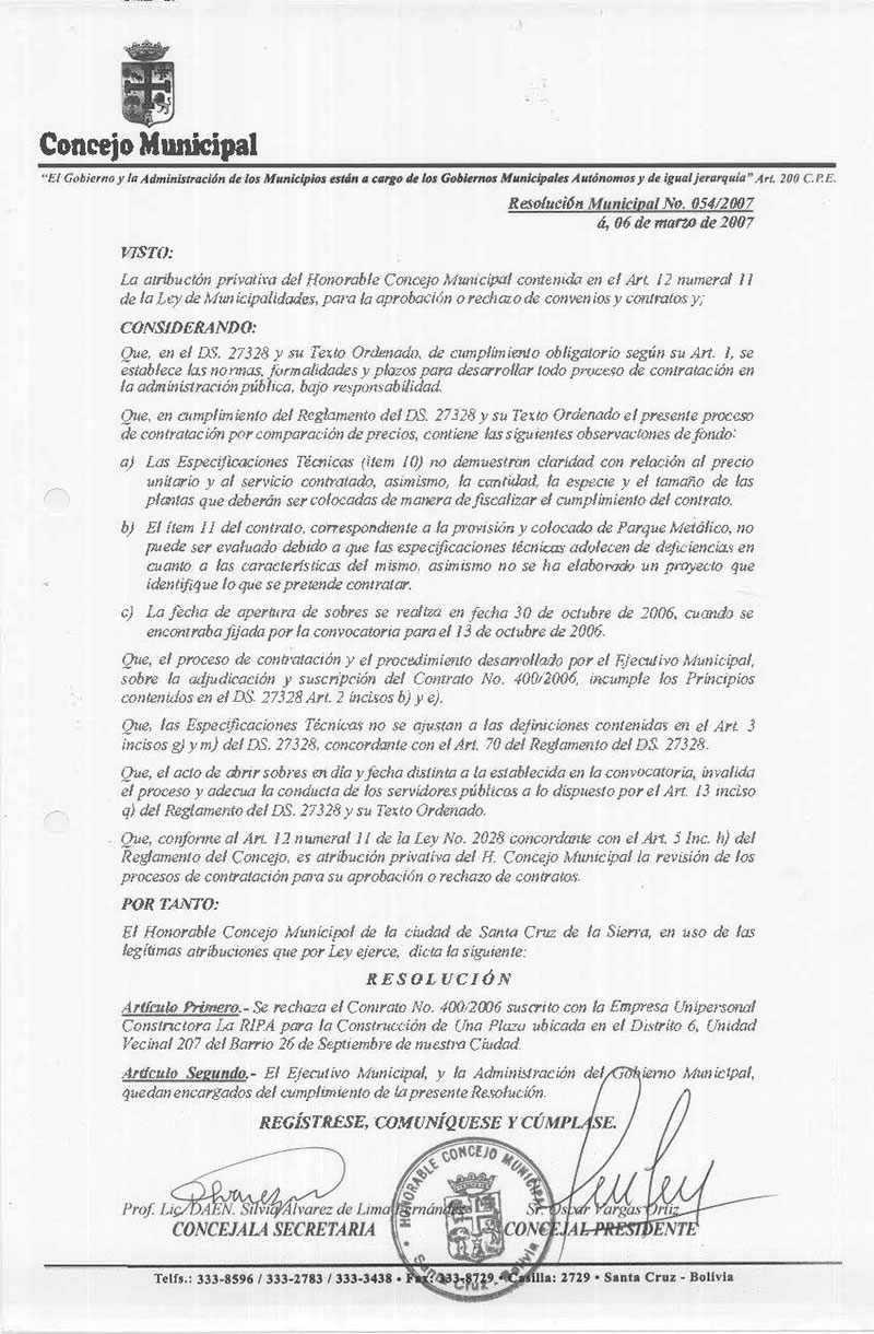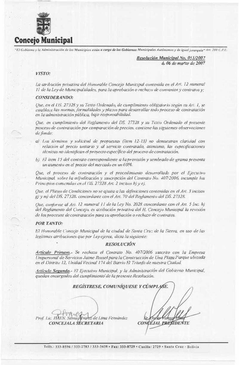 Rechaza el Contrato N° 407/2006 suscrito con la Empresa Unipersonal de Servicios Jaime Rossel para la Construcción de Una Plaza Parque ubicada en el Distrito 12, Unidad Vecinal 174 del Barrio El Triunfo de nuestra Ciudad.
