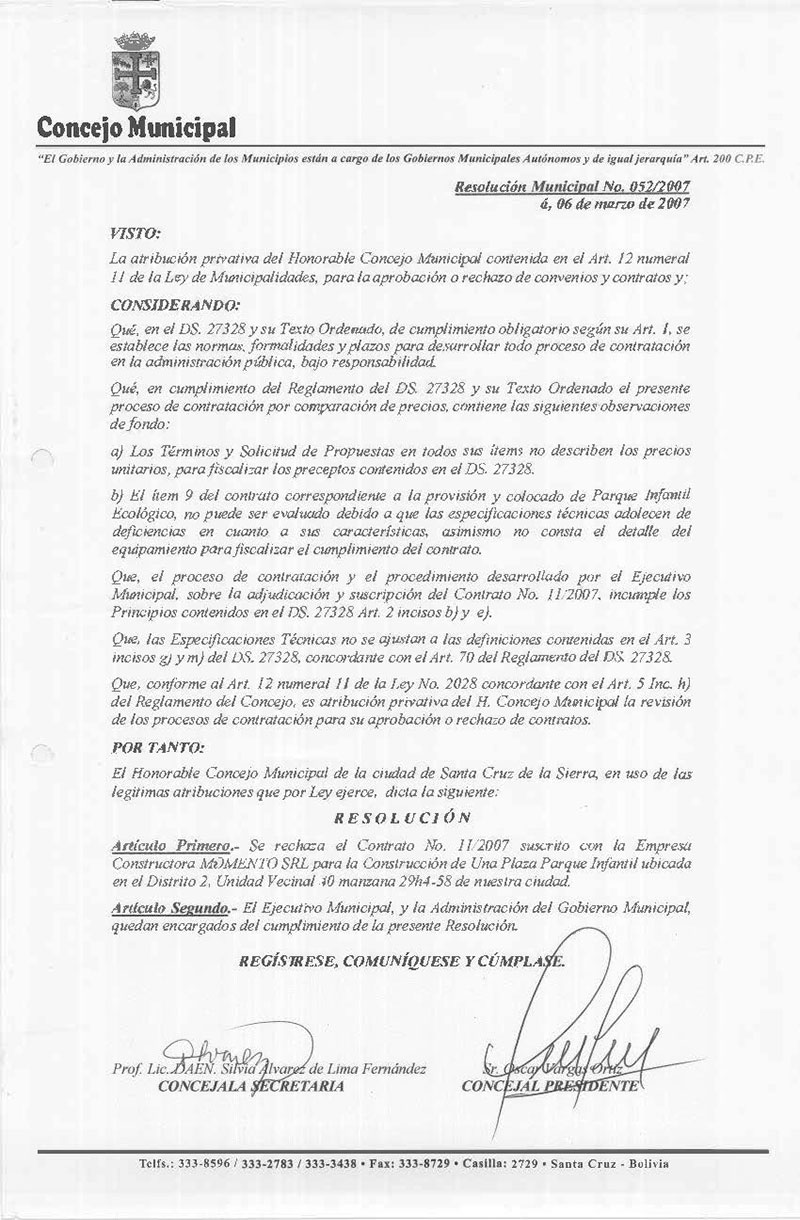 Rechaza el Contrato N° 11/2007 suscrito con la Empresa Constructora MOMENTO SRL para la Construcción de Una Plaza Parque Infantil ubicada en el Distrito 2, Unidad Vecinal 40 manzana 29h4-58 de nuestra ciudad.