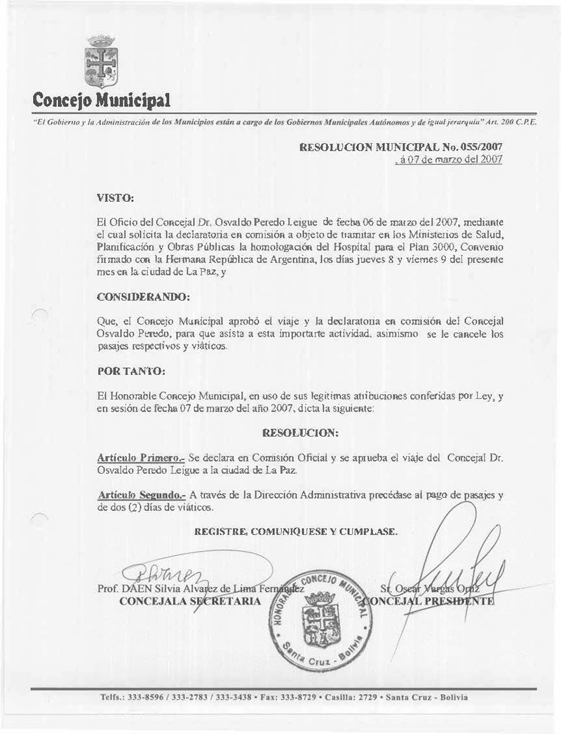 Declara en Comisón oficial y aprueba el viaje del concejal Dr. Oswaldo Peredo a la ciudad de La Paz.