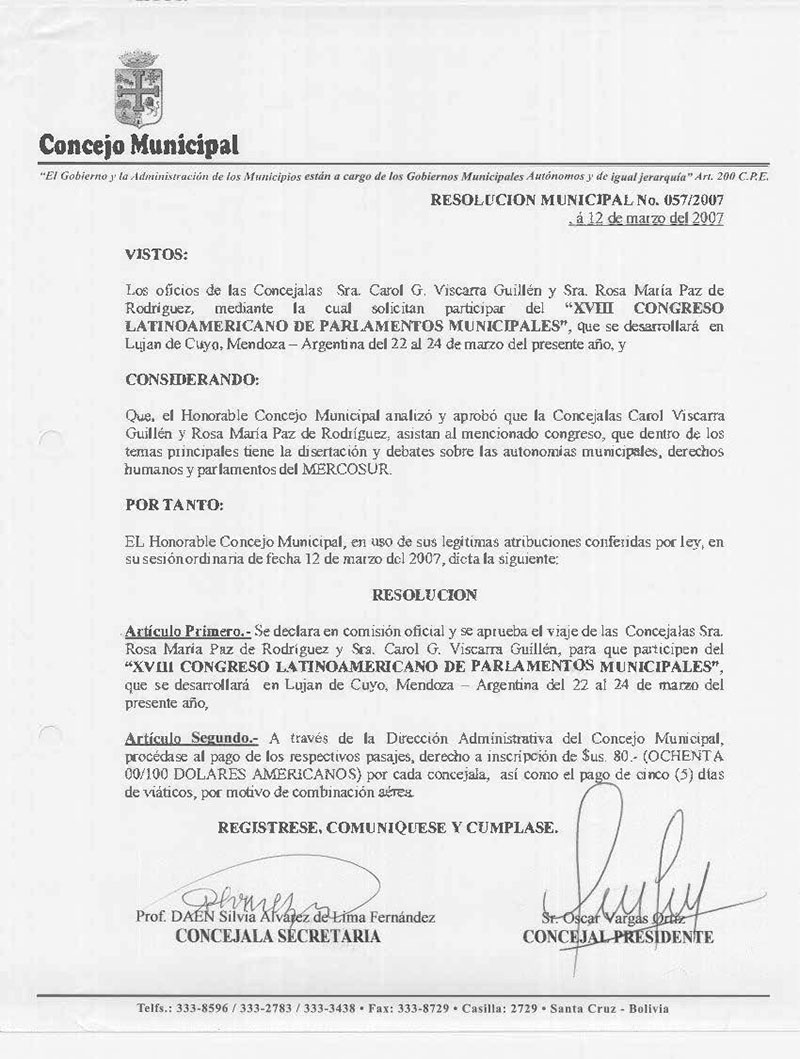 Declara en ComisIón oficial y se aprueba el viaje de la concejal Sra. Rosa Maria Paz de Rodríguez y Sra. Carol Viscarra Guillen, para participar del XVIII Congreso latinoamericano de Parlamentos Municipales a realizarse en Lujan de Cuyo, Mendoza - Argentina.