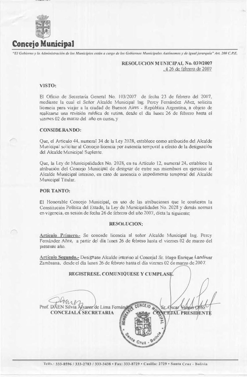 Concede licencia al Señor Alcalde Municipal Ing. Percy Fernandez Añez, del día lunes 26 de febrero hasta el viernes 02 de marzo del presente año y Designa como Alcalde interino al Concejal Sr. Hugo Enrique Landivar Zambrana.