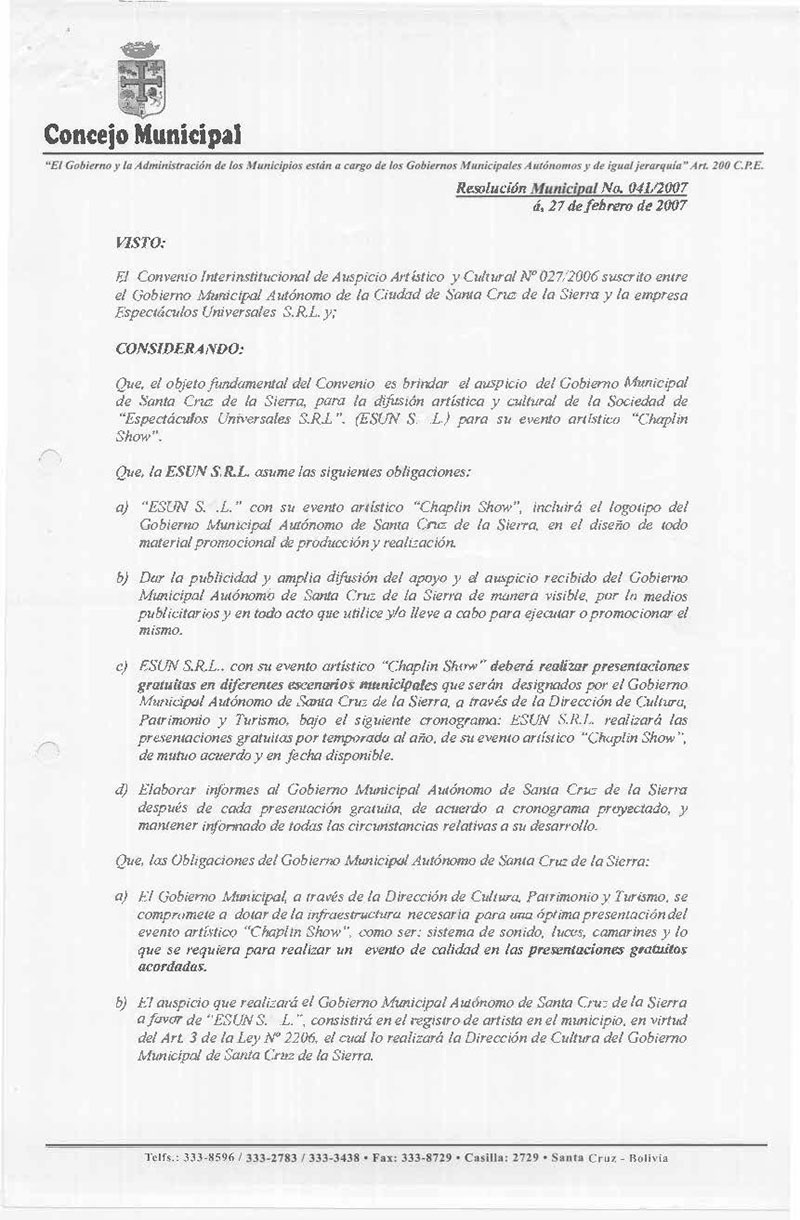 Aprueba el Convenio Interinstitucional de Auspicio Artístico y Cultural Nº 027/2006, suscrito entre el Gobierno Municipal Autónomo de Santa Cruz y la Empresa Espectáculos Universales S.R.L. (ESUN S.R.L.), para el fomento de las actividades culturales y artísticas en el Municipio de la ciudad de Santa Cruz de la Sierra.