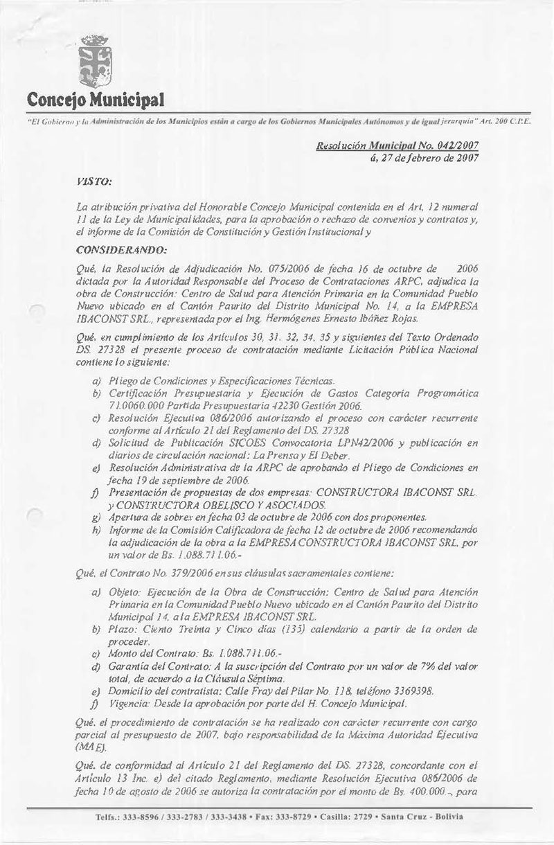 Aprueba el Contrato N° 379/2006 con la EMPRESA CONSTRUCTORA IBACONST SRL., para ejecutar la obra de Construcción: Centro de Salud para Atención Primaria en la Comunidad Pueblo Nuevo ubicado en el Cantón Paurito del Distrito Municipal N° 14.