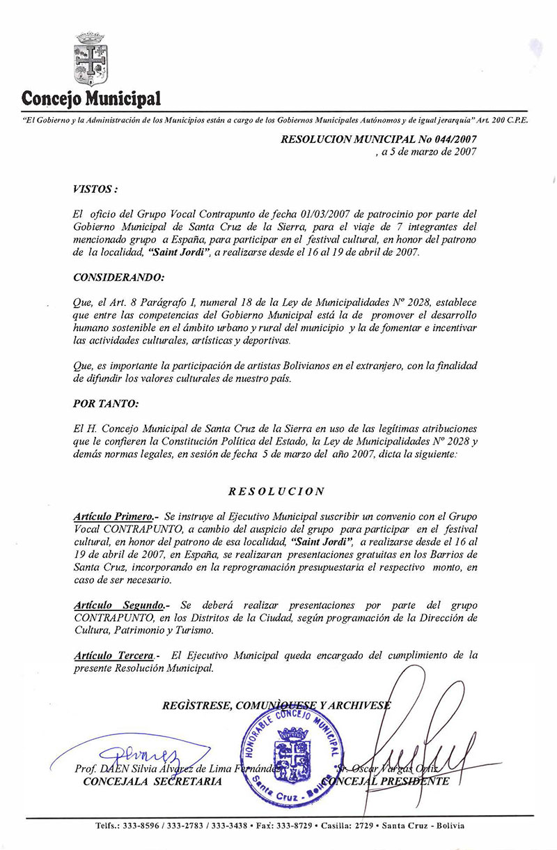 Instruye al Ejecutivo Municipal suscribir un convenio con el Grupo Vocal CONTRAPUNTO, de auspicio para participar en el festival cultural, en honor del patrono de esa localidad, “Saint Jordi”, a realizarse en España, quienes posteriormente se realizaran presentaciones gratuitas en los Barrios de Santa Cruz.