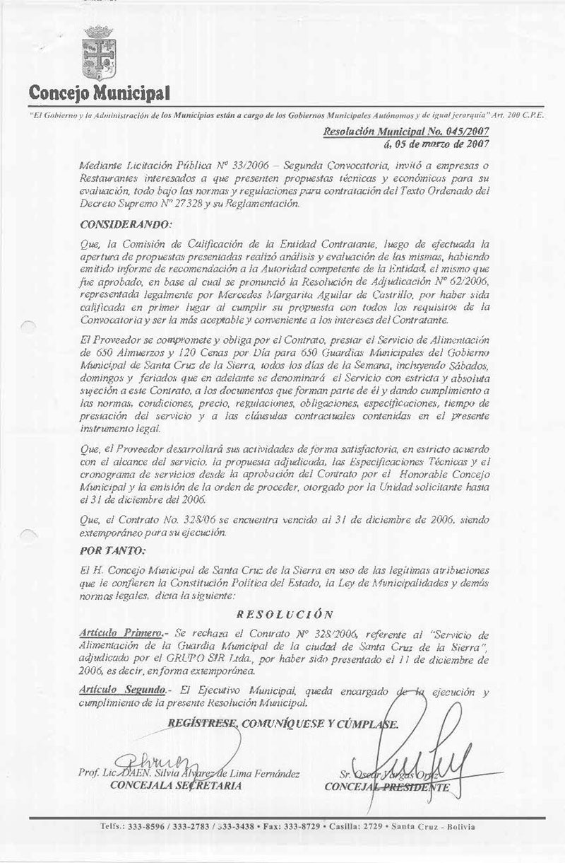 Rechaza el Contrato Nº 328/2006, referente al “Servicio de Alimentación de la Guardia Municipal de la ciudad de Santa Cruz de la Sierra”, adjudicado por el GRUPO SIR Ltda., por haber sido presentado el 11 de diciembre de 2006, es decir, en forma extemporánea.