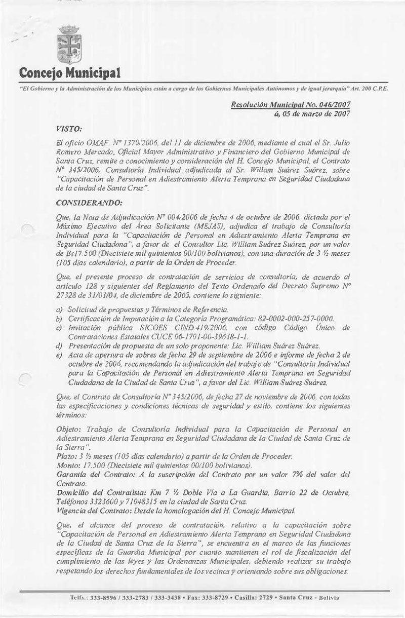 Aprueba el Contrato Nº 345/2006 “Consultoría de Capacitación de Personal en Adiestramiento Alerta Temprana en Seguridad Ciudadana de la Ciudad de Santa Cruz de la Sierra”.