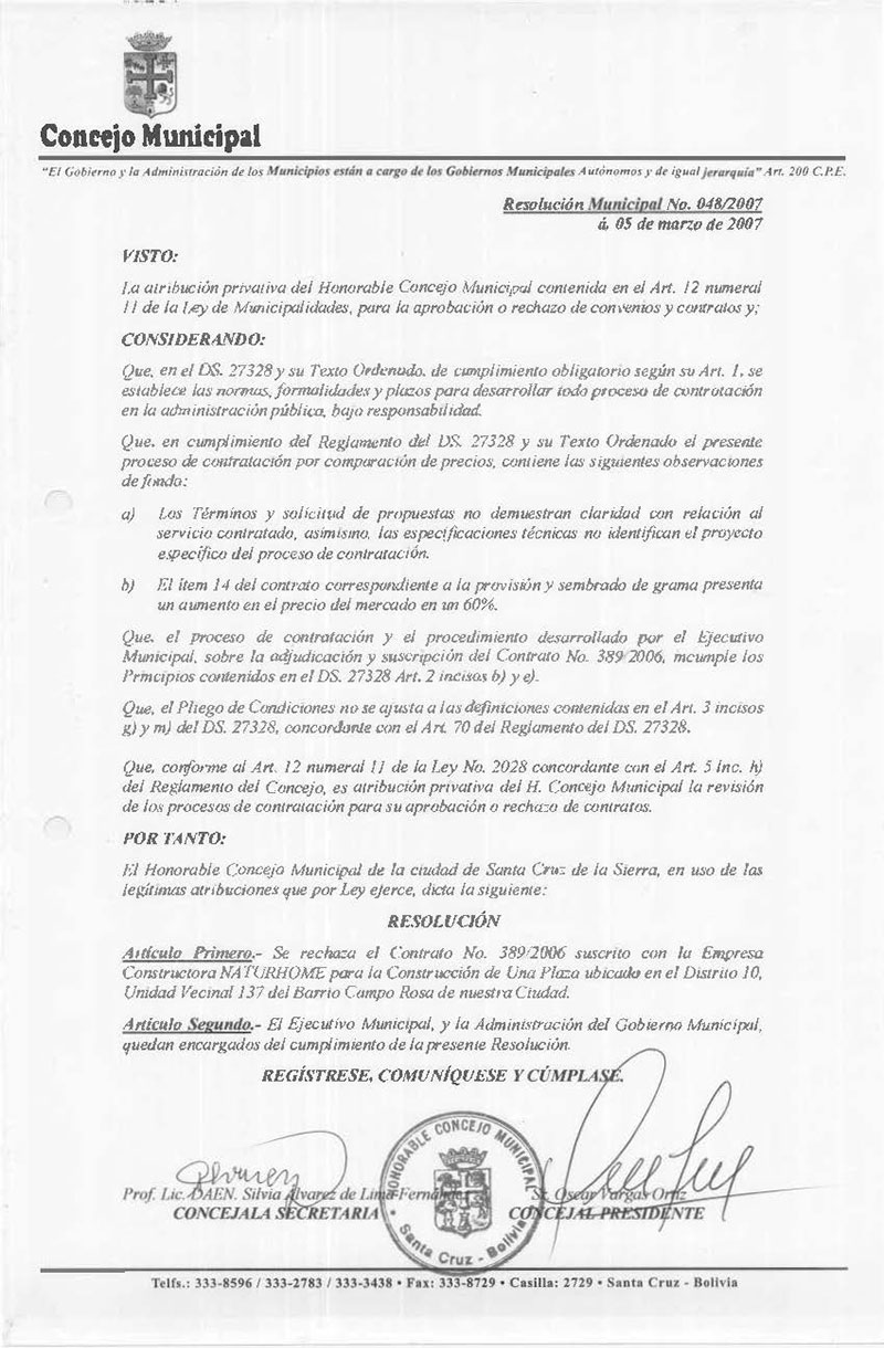 Rechaza el Contrato N° 389/2006 suscrito con la Empresa Constructora NATURHOME para la Construcción de Una Plaza ubicada en el Distrito 10, Unidad Vecinal 137 del Barrio Campo Rosa de nuestra Ciudad.