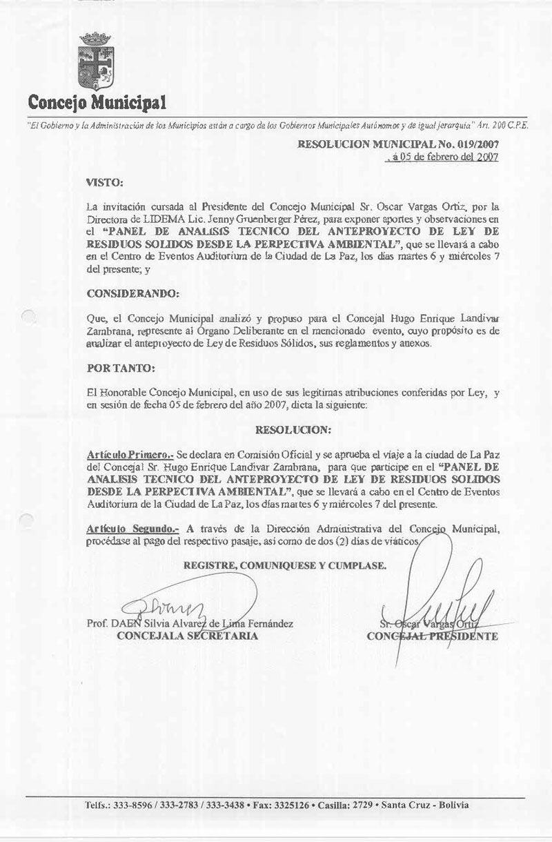 Declara en Comisión Oficial y se aprueba el viaje a la ciudad de La Paz den Concejal Sr. Hugo Landivar Zambrana, para que participe en el PANEL DE ANÁLISIS TÉCNICO DEL ANTEPROYECTO DE LEY DE RESIDUOS SÓLIDOS DESDE LA PERSPECTIVA AMBIENTAL" que se llevará a cabo en el Centro de Eventos Auditorium de la Ciudad de La Paz.