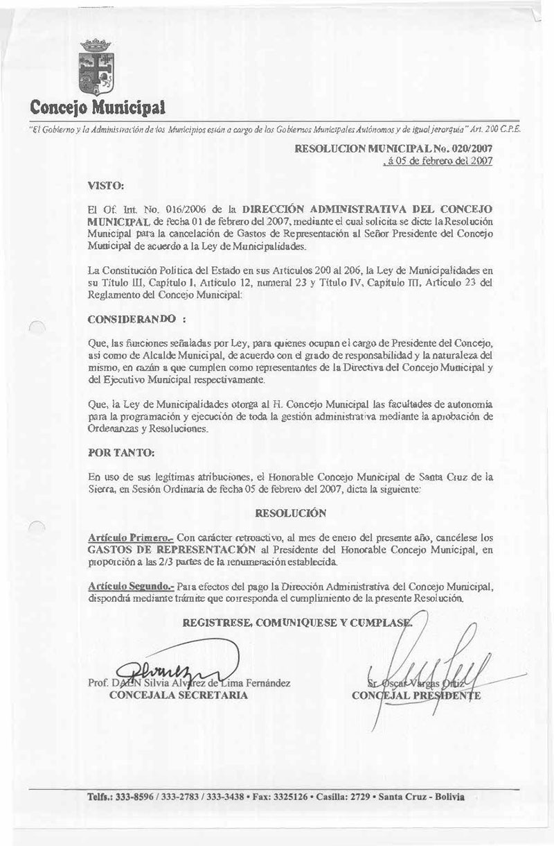 Aprueba los Gastos de Representación del Presidente del Honorable Concejo Municipal de Santa Cruz de la Sierra.