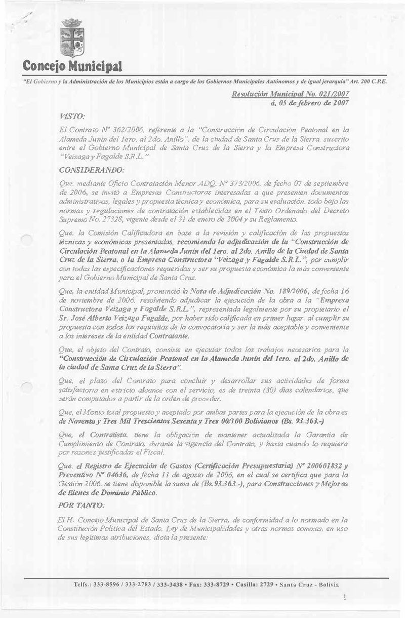 Aprueba el Contrato Nº 362/2006, referente a la “Construcción de Circulación Peatonal en la Alameda Junín del 1° al 2°. Anillo”, de la ciudad de Santa Cruz de la Sierra, suscrito con la Empresa Constructora “VEIZAGA Y FAGALDE S.R.L.”.