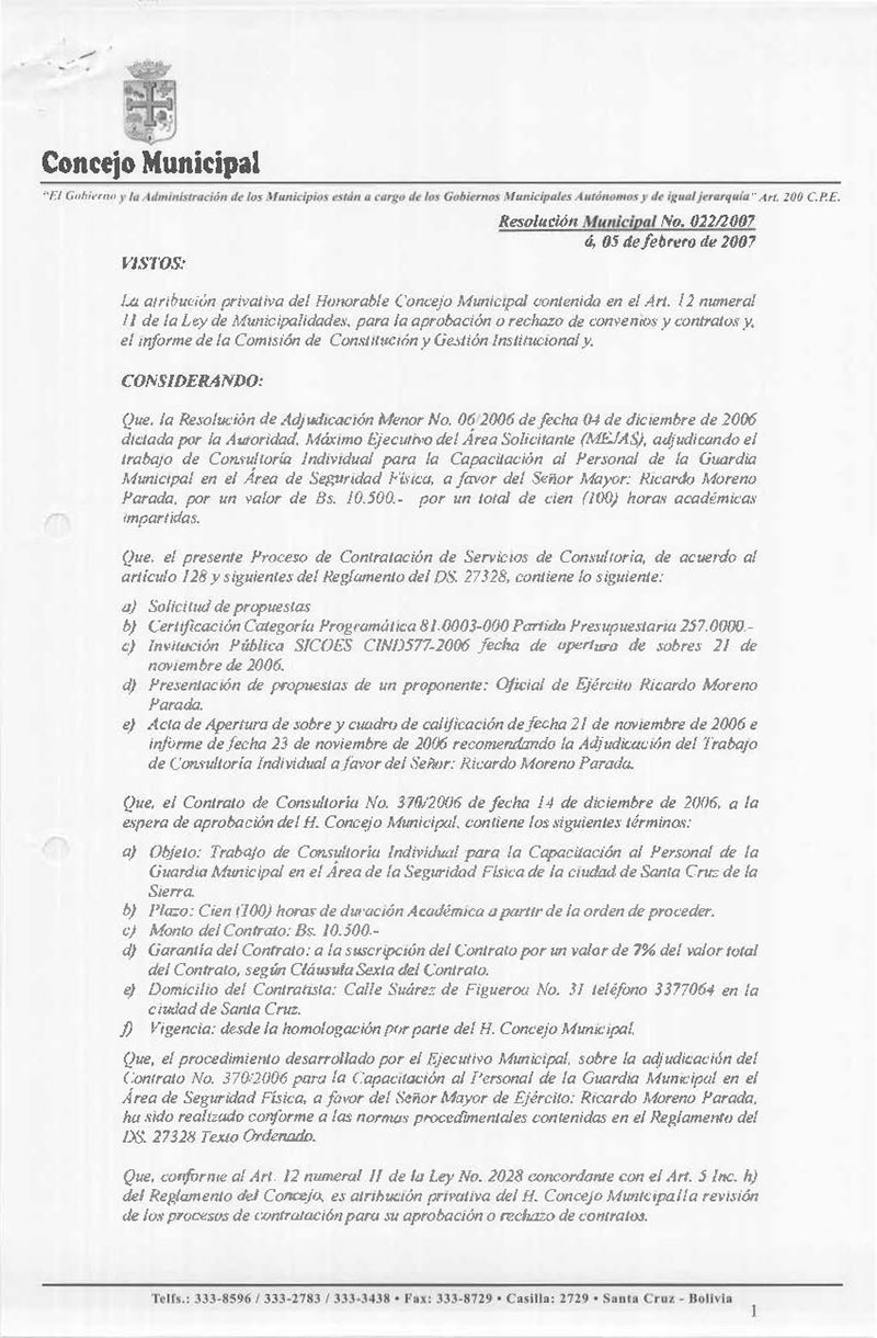 Aprueba el Contrato N° 370/2006 adjudicado al Señor Mayor de Ejército Ricardo Moreno Parada, para la Capacitación al Personal de la Guardia Municipal en el Área de Seguridad Física, por un valor de Bs. 10.500.- (Diez Mil Quinientos 00/100 Bolivianos), por cien (100) horas académicas impartidas.