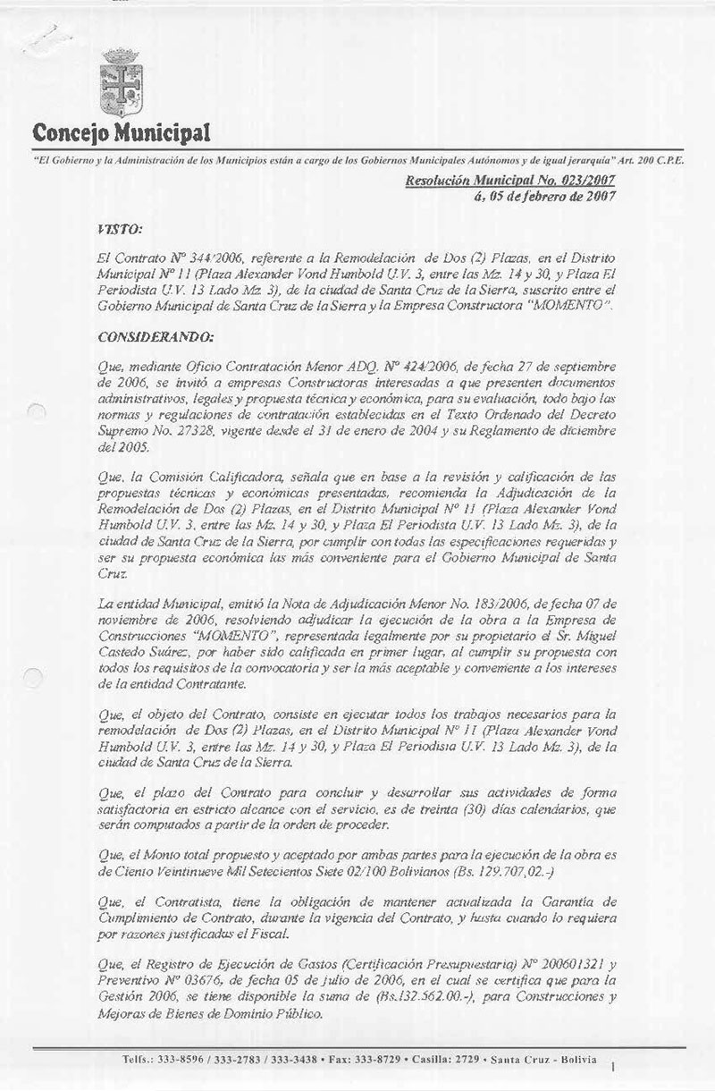 Aprueba el Contrato Nº 344/2006, referente a la Remodelación de Dos (2) Plazas, en el Distrito Municipal Nº 11 (Plaza Alexander Vond Humbold U.V. 3, entre las Mz. 14 y 30, y Plaza El Periodista U.V. 13 Lado Mz. 3), de la ciudad de Santa Cruz de la Sierra, suscrito con la Empresa Constructora “MOMENTO”.