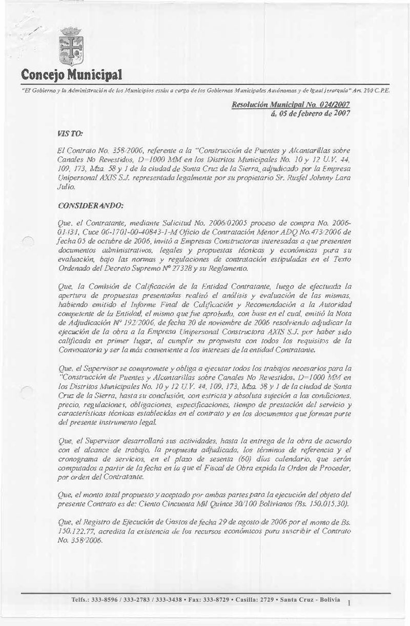 Aprueba el Contrato N° 358/2006, referente a la “Construcción de Puentes y Alcantarillas sobre Canales No Revestidos, D=1000 MM en los Distritos Municipales No. 10 y 12 U.V. 44, 109, 173, Mza. 58 y 1 de la ciudad de Santa Cruz de la Sierra, adjudicado por la Empresa Unipersonal AXIS S.J.