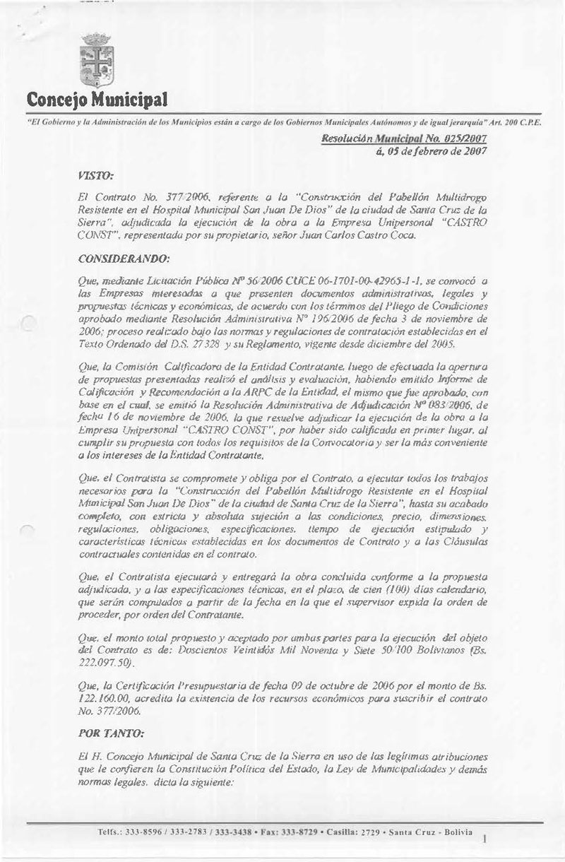 Aprueba el Contrato N° 377/2006, referente a la “Construcción del Pabellón Multidrogo Resistente en el Hospital Municipal San Juan De Dios” de la ciudad de Santa Cruz de la Sierra”, adjudicada a la Empresa Unipersonal “CASTRO CONST”.