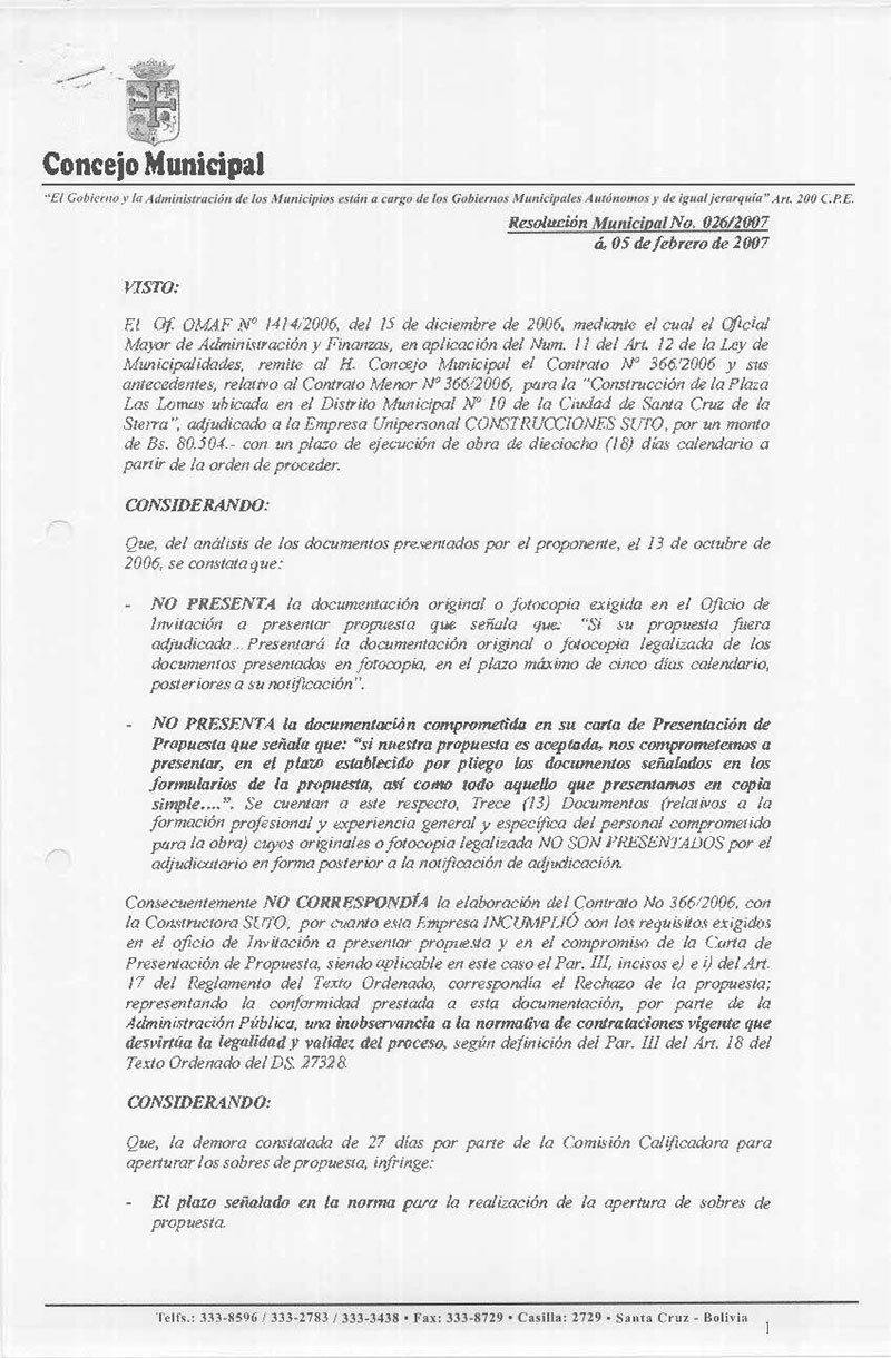 Rechaza el Contrato N° 366/2006, relativo a la Construcción de la Plaza Las Lomas, Ubicada en el Distrito N° 10, por incumplimiento de requisitos establecidos en lo Términos de Referencia de la Convocatoria.