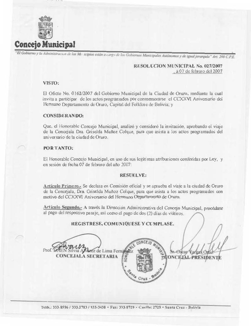 Declara en Comisión Oficial y aprueba el viaje de la Concejal Dra. Griselda Muñoz, para participar en actos programados del CCXXVI Aniversario Departamento de Oruro.
