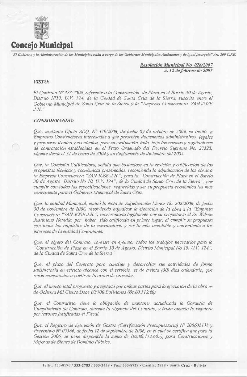 Aprueba el Contrato Nº 383/2006, referente a la Construcción de Plaza en el Barrio 30 de Agosto, Distrito Municipal Nº10, U.V. 124, de la Ciudad de Santa Cruz de la Sierra, suscrito con la “Empresa Constructora SAN JOSE J.H.”.
