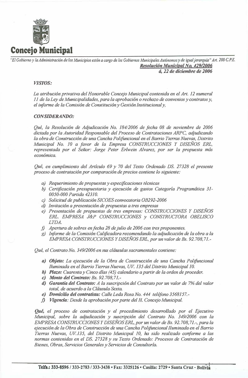 Aprueba el Contrato N° 349/2006 con la EMPRESA CONSTRUCCIONES Y DISEÑOS ERL., para la ejecución de la Obra de Construcción de una Cancha Polifuncional Iluminada en el Barrio Tierras Nuevas, UV.135 del Distrito Municipal N°10, por un valor de Bs. 92.708,71 (Noventa y Dos Mil Setecientos Ocho 71/100 Bolivianos).