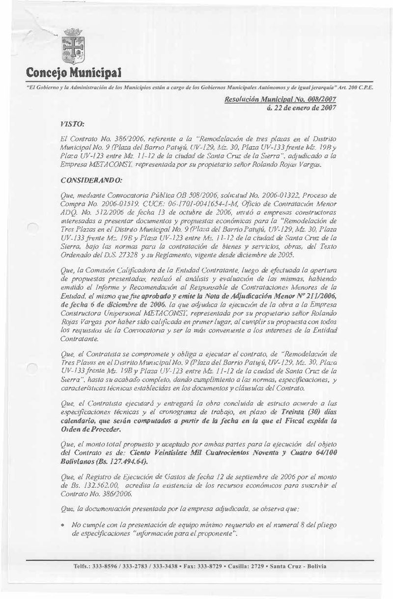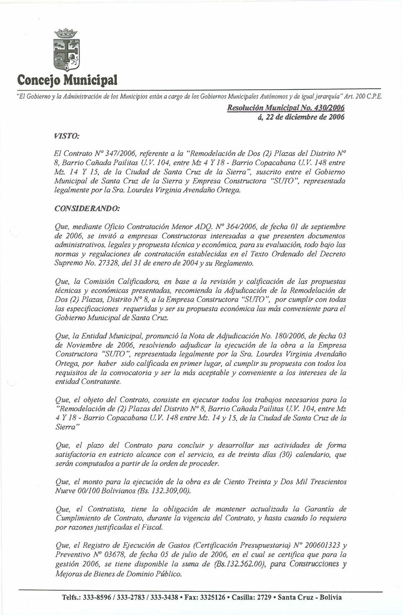 Aprueba el Contrato N° 347/2006, referente a la “Remodelación de Dos (2) Plazas del Distrito N° 8, Barrio Cañada Pailitas, UV-104, entre Mza. 4 y 18, Barrio Copacabana UV-148 entre Mz. 14 y 15 de la Ciudad de Santa Cruz de la Sierra”, suscrito con la Empresa Constructora “SUTO”.