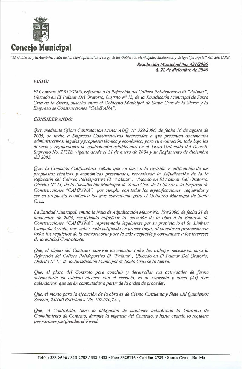 Aprueba el Contrato Nº 355/2006, referente a la Refacción del Coliseo Polideportivo El “Palmar”, Ubicado en El Palmar Del Oratorio, Distrito Nº 13, de la Jurisdicción Municipal de Santa Cruz de la Sierra, suscrito con la Empresa de Construcciones “CAMPAÑA”.