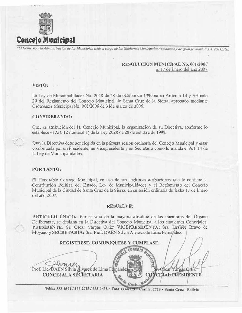Designa la Directiva del Concejo Municipal como PRESIDENTE: Sr. Oscar Vargas Ortiz; VICEPRESIDENTA: Sra. Desirée Bravo de Moyano y SECRETARIA: Prof. DAEN Silvia Álvarez de Lima Fernández.