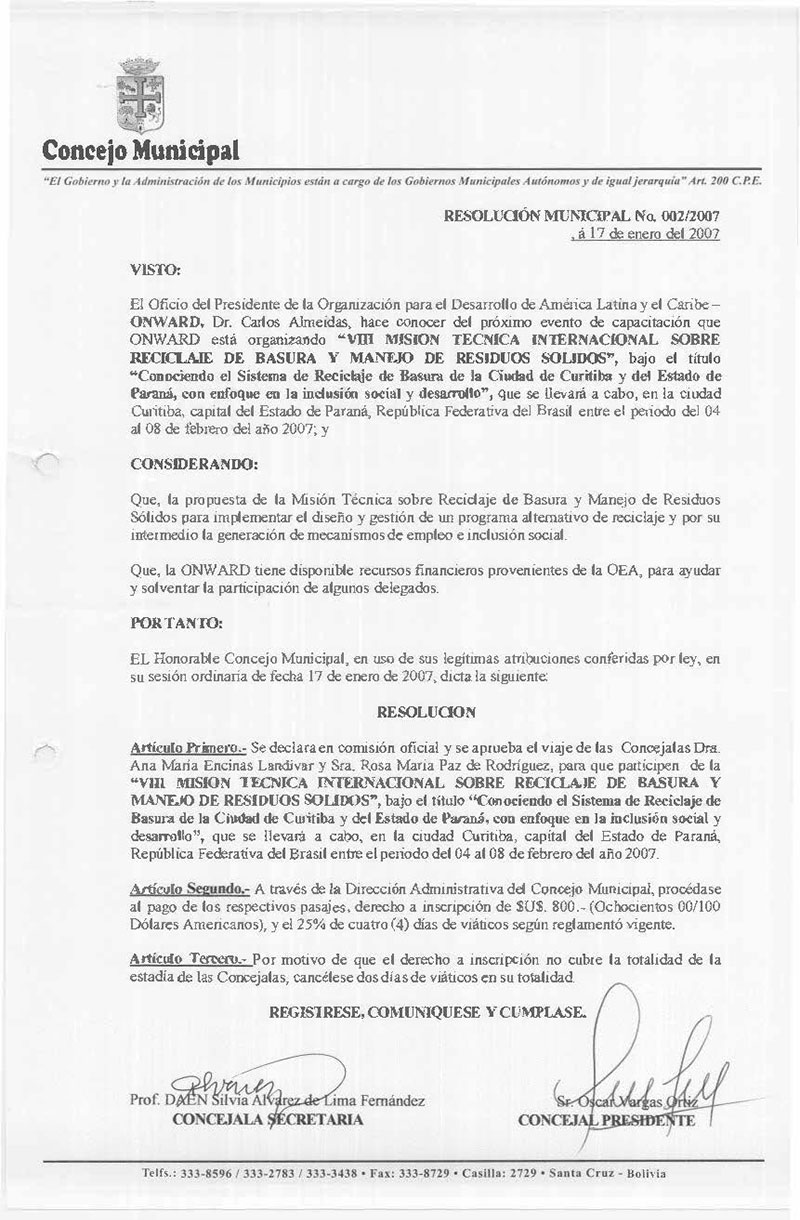 Declara en Comisión Oficial y se aprueba el viaje de las Concejales Dra. Ana Maria Encinas y la Sra. Rosa Maria Paz de Rodriguez para que participen de la "VII MISIÓN TÉCNICA INTERNACIONAL SOBRE RECICLAJE DE BASURA Y MANEJO DE RESIDUOS SÓLIDOS", en la ciudad de Curitiba, Capital del Estado de Paraná República Federativa del Brasil.