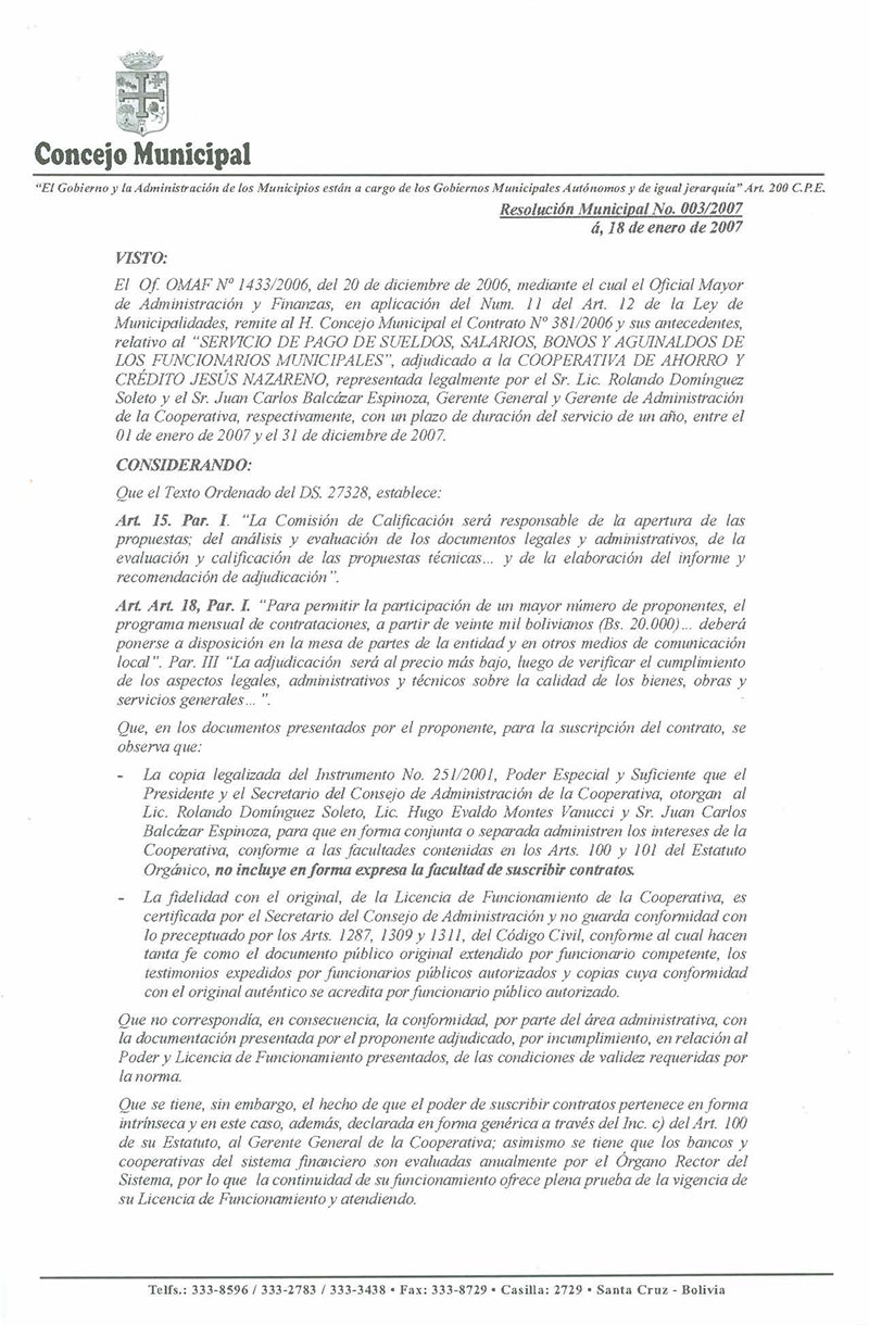 Se aprueba contrato 381/2006 relativo al SERVICIO DE PAGO DE SUELDOS,SALARIOS,BONOS Y AGUINALDOS DE LOS FUNCIONARIOS MUNICIPALES a la COOPERATIVA DE AHORRO Y CREDITO JESUS NAZARENO.