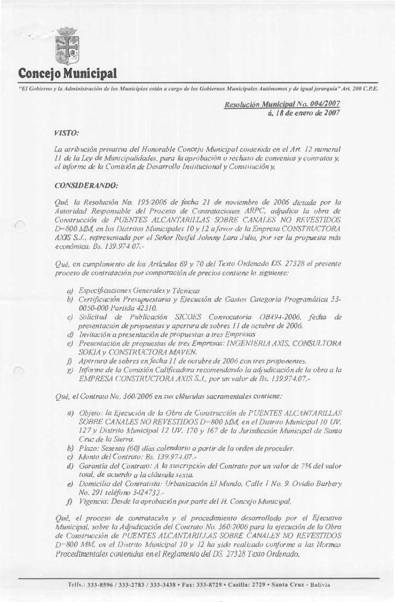 Aprueba Contrato N° 360/2006 para la construcción de Puentes Alcantarillas sobre canales no revestidos D 800 MM en los Distrito Municipales N° 10 y 12, por un monto de Bs. 139.974.07 (Ciento Treinta y Nueve Mil Novecientos Setenta y Cuatro 07/100 Bolivianos), suscrito con la Empresa Constructora AXIS S.J.